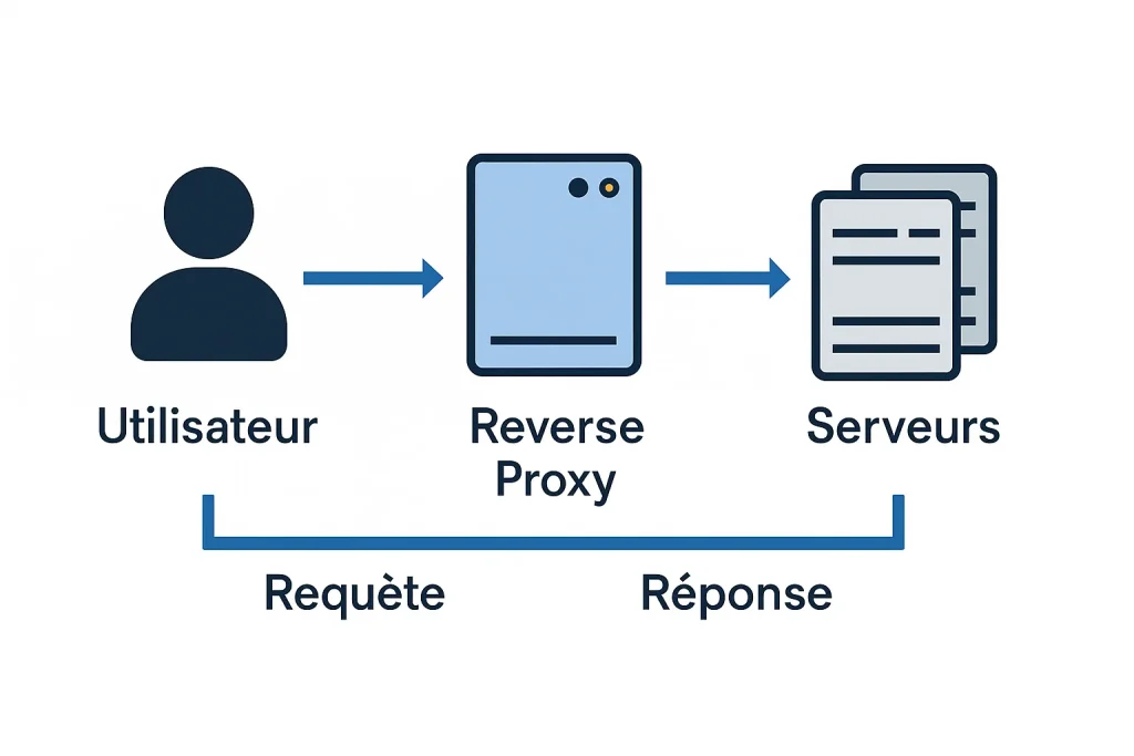 Un reverse proxy est un serveur placé devant un ou plusieurs serveurs web afin de recevoir les requêtes des utilisateurs et de les redistribuer vers les machines internes.